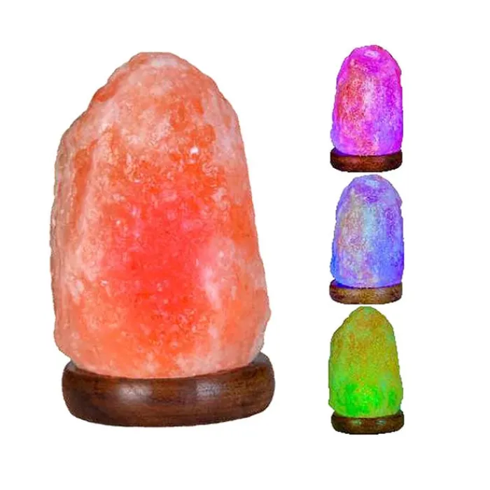 Esta lámpara de sal de acción purificante contiene unas propiedades específicas que depuran el ambiente. Elaboradas con sal procedente del Himalaya, de acción eficaz y prolongada. Su color va alternando constantemente entre violeta, rojo, verde, amarillo y azul. Incluye un cable de alimentación con conexión a la corriente de 120cm, bombilla de bajo consumo de 15v y una peana de madera para proteger cualquier superficie.