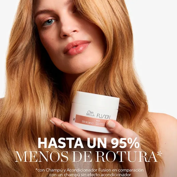 Su formulación con tecnología de fusión silksteel, contiene aminoácidos de seda y lípidos micronizados que aumentan la resistencia del cabello frente a la rotura originada como consecuencia del peinado y daño mecánico diario. Incluye metal purifier que protege el cabello contra los metales perjudiciales presentes en el agua. Wella Professionals Fusion Mask está indicada para desenredar, suavizar y fortalecer el cabello seco y dañado, luce más manejable, fuerte, sedoso y brillante.