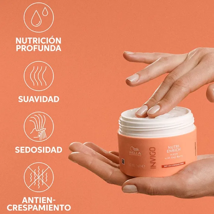 Esta mascarilla nutritiva de uso profesional restaura la vitalidad y elasticidad de las fibras capilares gracias a su formulación nutri-enrich-blend ™. Incluye pantenol, ácido oleico, vitamina E y baya de Goji ricas en péptidos, minerales y vitaminas que hidratan, nutren y reestablecen el confort del cabello. Wella Professionals Invigo Nutri Enrich Mask está indicada para combatir el cabello estresado, seco o dañado sin apelmazar. Luce sedoso, flexible y radiante, visiblemente revitalizado.